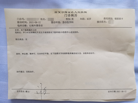 00点45分,PROMA医疗团队联系当地医院获取第一手医疗信息,了解到客户于8月12日晚骑摩托车发生意外,导致下肢疼痛,叫120急救车送至西安市阎良区人民医院,诊查发现右下肢踝关节局部肿胀疼痛活动欠佳,余肢体活动可。初步诊断右侧外踝骨折。因时值凌晨,条件有限,先收治入院,待之后进行进一步治疗。PROMA医疗团队初步评估,对当地医院诊断无异议,持续关注病情发展,待稍后做进一步评估。