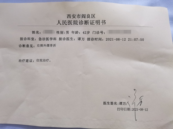 8月13日凌晨00点30分接保险公司报案,客户于8月12日晚在陕西西安出车祸,经120急救送医,经医院诊断脚踝骨折需手术处理。PROMA接案后迅速安排案件专员对接沟通,搜集客户信息、医疗信息等。第一时间由资深案件经理牵头、组成由案件专员与救援医生协同的“医疗团队小组”,及时跟进整个案件情况。