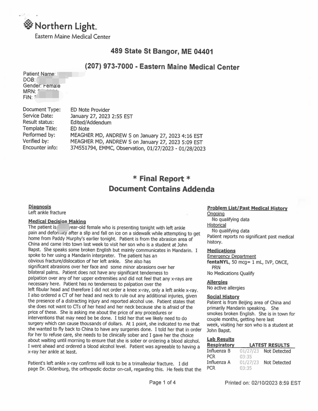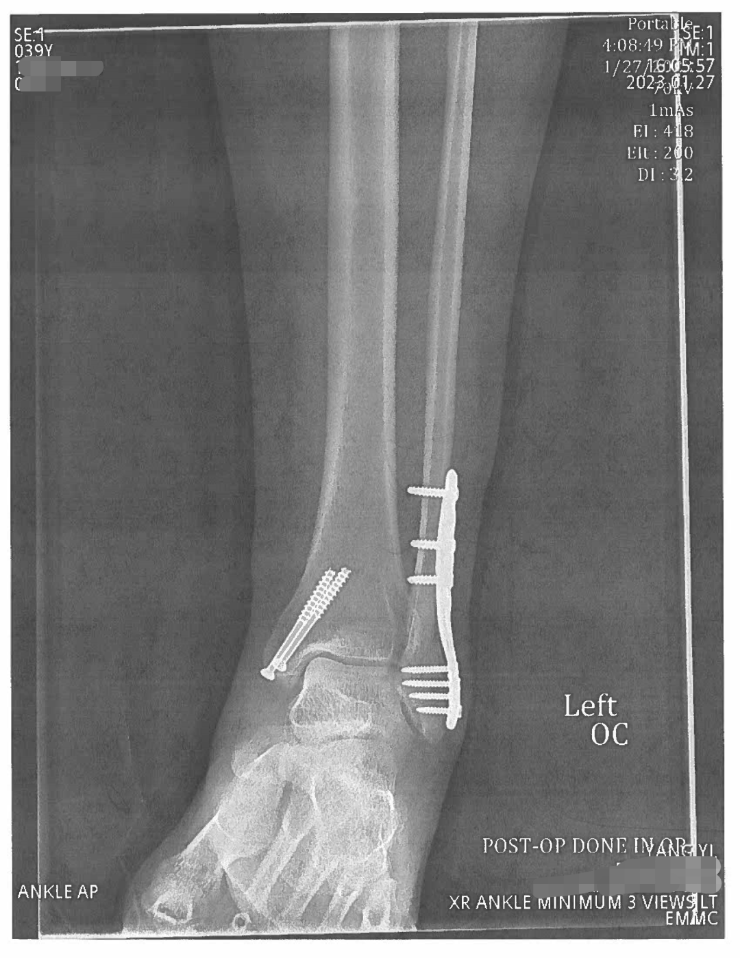 23:19,PROMA案件小组成功与客户Y女士取得联系,获悉客户于2023年1月13日前往美国班戈探望在美留学的儿子,1月27日晚从饭店返回住处途中,因地面结冰路滑不慎摔倒,随即前往当地Eastern Maine Medical Center紧急就诊。医院在经过X光等检查后确诊左脚踝骨折。经医院骨科会诊后于1月28日进行了相关钢钉固定门诊手术,辅以支具辅助。建议客户2周后(2月10日)复诊。