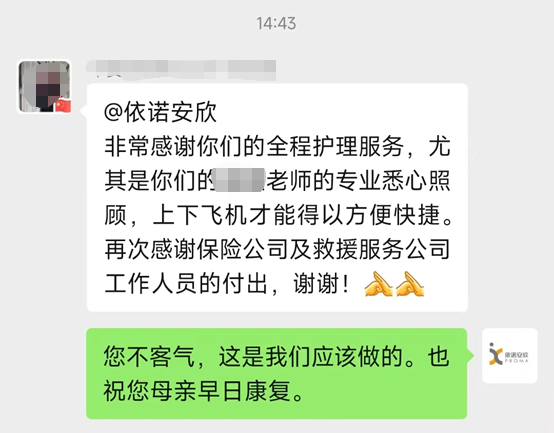 点评:此案突出展示了PROMA快速响应,专业主导,贴心服务的独特理念。7*24的专业案件医疗团队,凭借自身丰富的转运经验和当地强大的救援网络,从接到客户报案电话起,不到24个小时即完成了医疗评估、救援方案制定、医疗转运等一系列专业操作,让客户安全舒适地回到了远在二千四百多公里之外的家乡,得到了客户及其家属的高度赞扬。在案件处理过程中更是凭借自身丰富的经验,及时捕捉到客户的焦虑情绪,在快速制定落实转运方案的同时,还第一时间进行心理安抚和疏导,将客户可能升级为对保司的投诉可能性化解于无形,并最终转换为客户对保司的高度赞扬,体现了PROMA对保司“君子一诺,托付安心”的承诺。