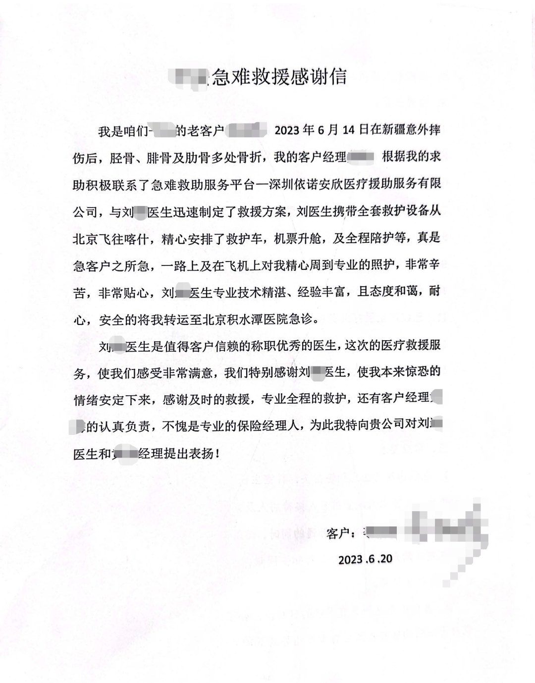 至此,从喀什至北京的医疗转运和送返任务顺利完成,长途旅行客户虽有些疲惫但生命体征平稳。在医护人员的照料下客户情况都在可控范围。客户对此次服务十分满意并书写了感谢信。