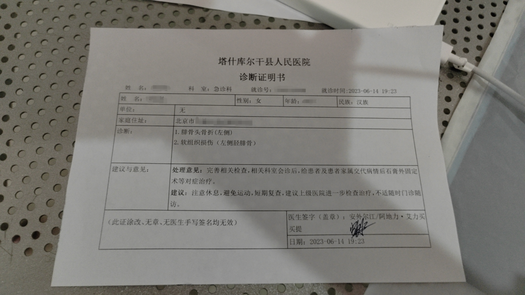 22:32,PROMA案件小组与客户取得联系,获悉客户常住地北京,6月与姐姐跟团前往新疆旅游,6月14日在塔什库尔干石头城旅游途中不慎摔倒导致膝盖骨折,随即被送往当地县医院治疗,进行了石膏固定。医院建议转诊至上级医院(喀什)进行手术。由于当地医疗条件有限,客户希望能紧急送返回北京继续治疗。