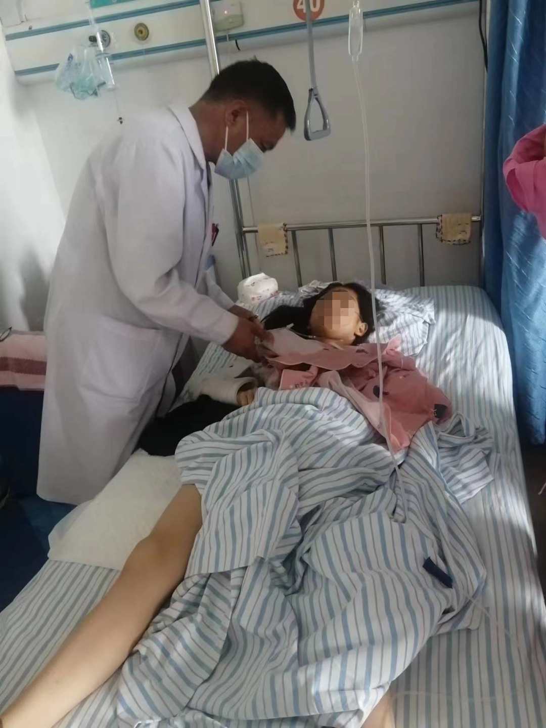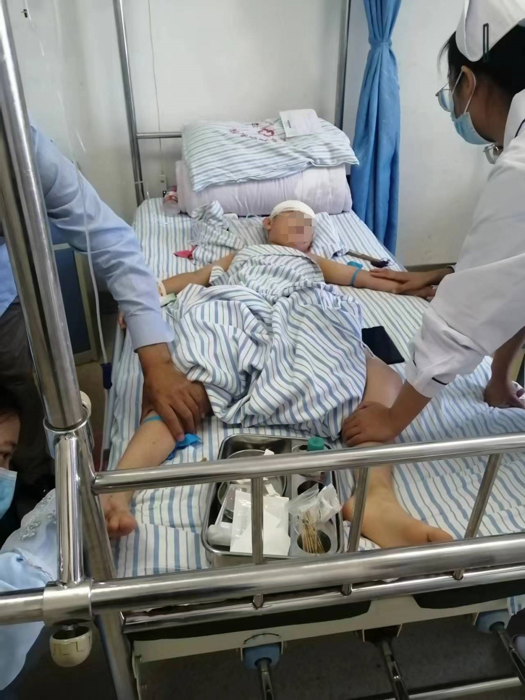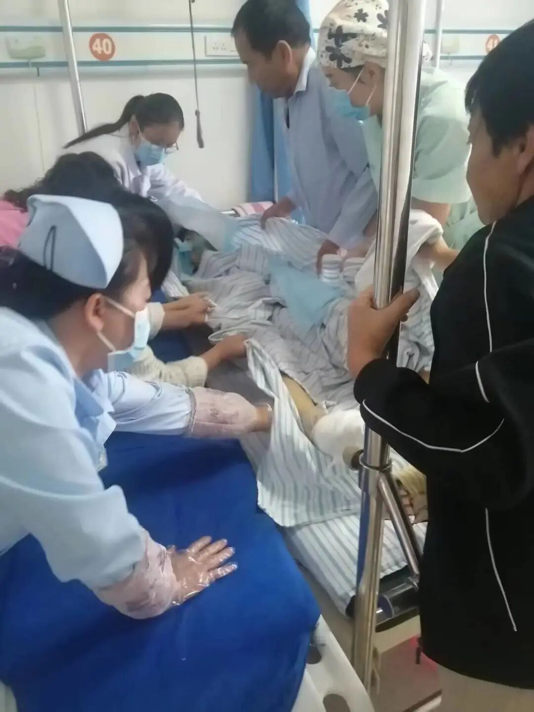 6月29日下午3时许,我司人员协调车队领队丁女士,一同前往格尔木人民医院住院部6楼骨科病房,并顺利见到了3位客户,同属一组主管医生团队负责。另一位客户R因其尚处于ICU病房,当天未得见,后又因主管医生不在,我司从值班医生处获取了病人的部分医疗信息,并从领队处获取第一现场照片。同时,我司现场人员尽可能地安抚了病人家属:孩子妈妈、孩子舅舅及孩子家教,并约定次日一早再来了解最新情况。