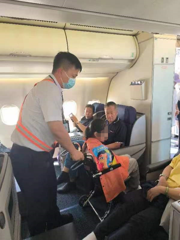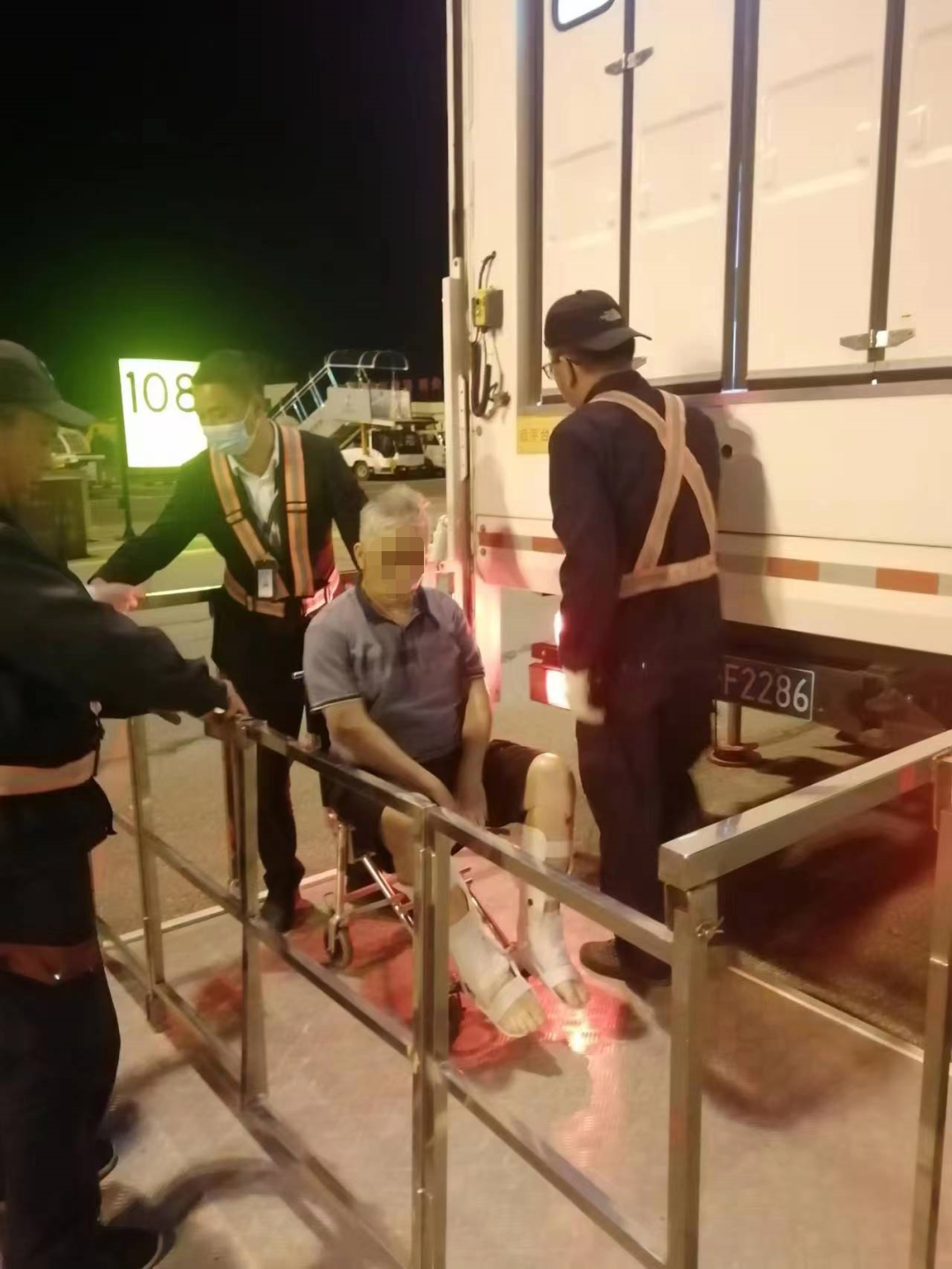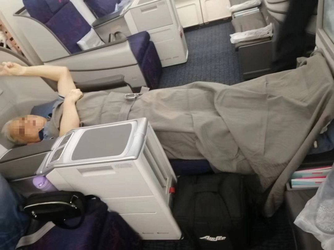 因格尔木机场距离医院比较近,车程仅需20-30分钟,所以我司提前了2小时出发,保留了足够的时间。M先生因为今天可以返程,昨天一夜激动得无法入睡,转运人员开始还担心他的血压会高;机场医务室医生测血压110/80mmHg,血氧也正常;顺利登机后因格尔木到西宁这段的航班商务舱的座椅无法放平到180度,但伤员的腿必须放平,好在我司提前准备了充气气囊,加上飞机上提供的枕头,病人感觉很舒服,安全到达西宁机场,等候转机。因天气原因,西宁到上海的航班晚点2个多小时,且西宁机场廊桥无法停靠空客330这种大机型,必须乘坐摆渡车。好在我司转运人员身经百战、经验丰富,事先预留了足够的时间,与机场及航司积极协调,终于让伤者顺利使用升降车,安全登机。空客330的商务舱座椅可以180度放平,客户M先生这时已安然入睡。