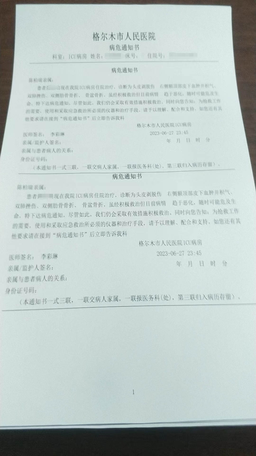 4)R,9岁,为S先生儿子,ICU住院,头皮剥脱伤,右侧额顶部皮下血肿并积气、双肺挫伤、双侧肋骨骨折、骨盆骨折,疑似插管,院方已下病危通知书