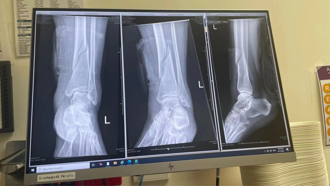 L女士从出租车上摔下后,因左腿疼痛来到 SVH 急诊室。经检查发现其左侧胫骨轴骨折(G1关节内开放性骨折),于 11月5日接受了左胫骨切开复位内固定手术治疗,无并发症。